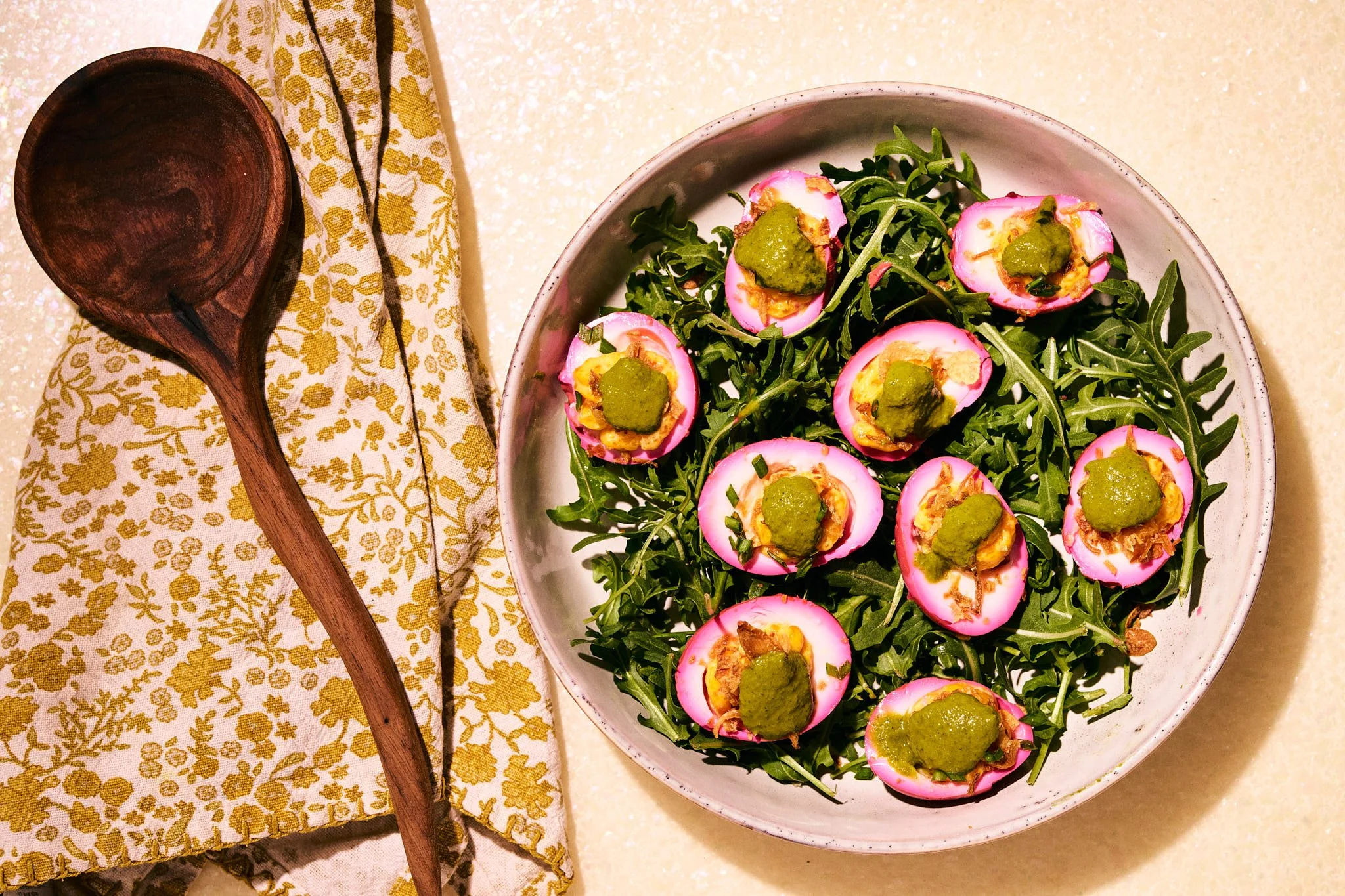 Next came one of the most visually striking dishes of the shoot: beet pickled deviled eggs. The eggs take on a soft rose hue from their beet brine, creating a striking contrast against greens and herbs on the plate. Camille finished them with crispy shallots, fresh herbs, and a mint-basil oil, adding both texture and brightness. Photographing this dish was all about balancing color. The pink of the eggs, the vibrant greens of the herb oil, and the golden shallots create a palette that feels fresh and modern while still grounded in classic flavors.