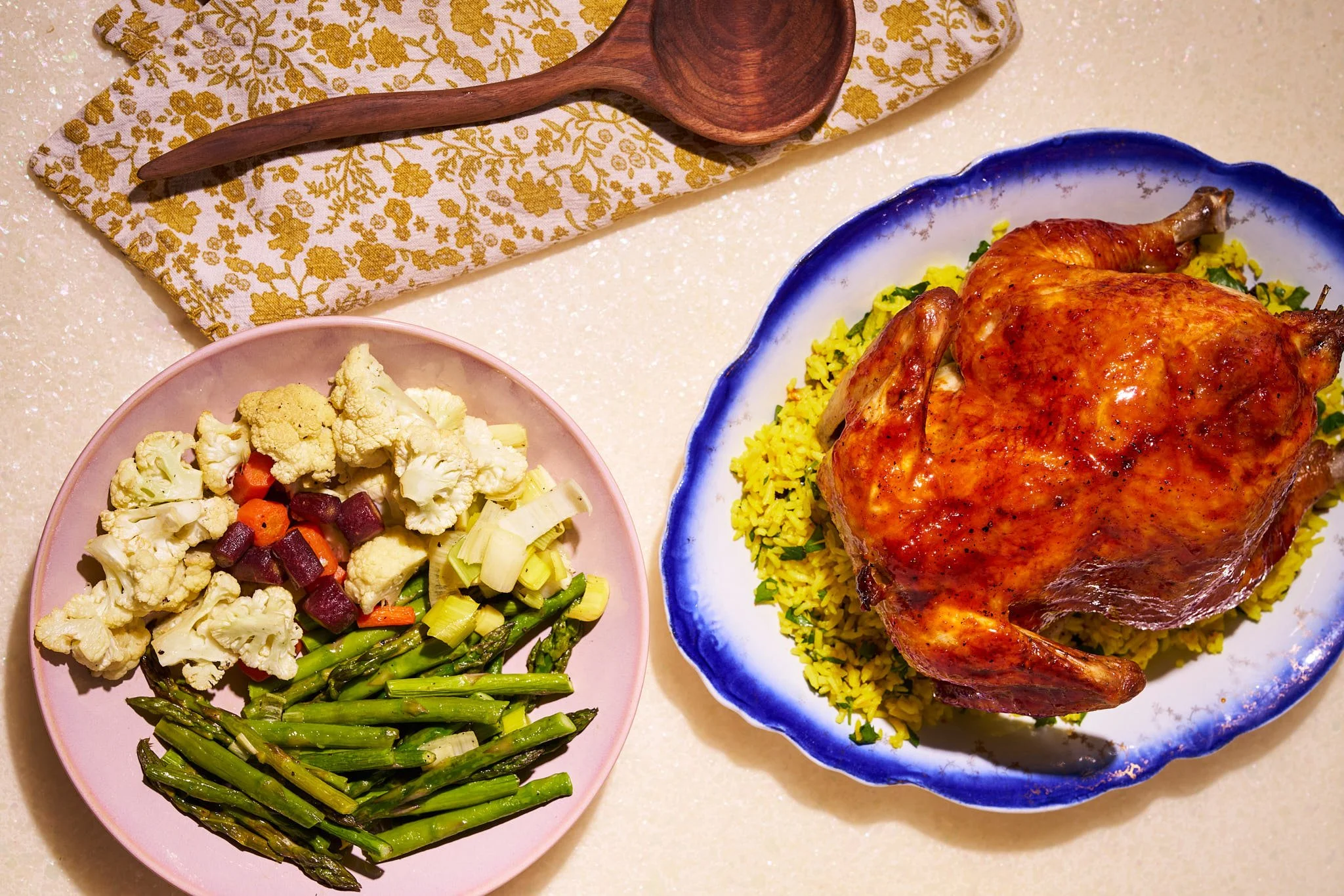 The centerpiece of the shoot was a whole roasted harissa chicken, a dish that feels both comforting and dramatic. The chicken is rubbed with smoky, spicy harissa and roasted until deeply golden. Around it are spring vegetables and couscous, soaking up the juices and spices from the roast. For photography, whole roasts create a beautiful sense of abundance. The shape of the chicken, the scatter of vegetables, and the texture of couscous or pilaf give the composition movement and warmth. A few herbs and a drizzle of sauce bring the final frame to life.