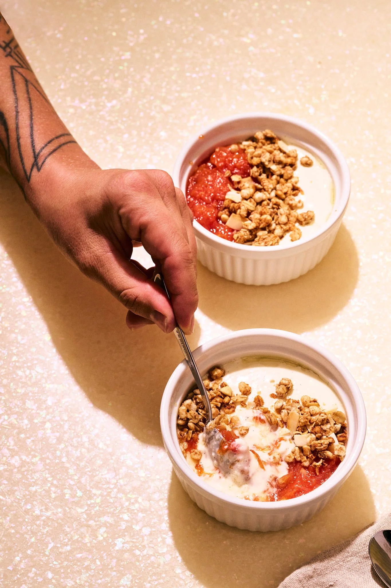 To finish the menu, Camille created a coconut panna cotta—light, creamy, and just sweet enough. It’s topped with granola crumble and fruit compote, which add texture and brightness to the silky dessert. The contrast between creamy panna cotta, crunchy granola, and vibrant fruit makes it both visually dynamic and refreshing. Desserts like this photograph beautifully because of their simplicity. Clean lines and subtle textures allow the ingredients to shine, while a touch of color from the compote keeps the image lively.